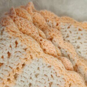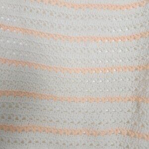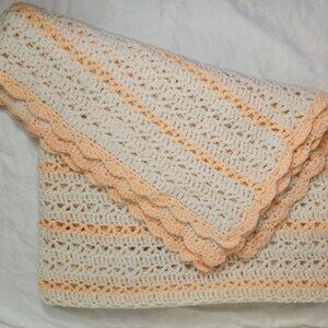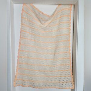 Creamy White Peachy Neon Pink Stripes Hand Knit Baby Blanket with Scallop Trim.