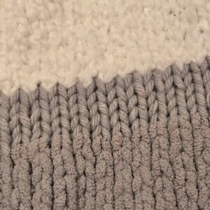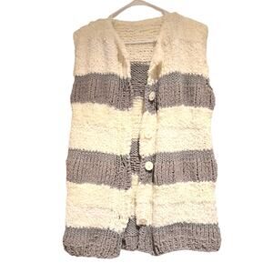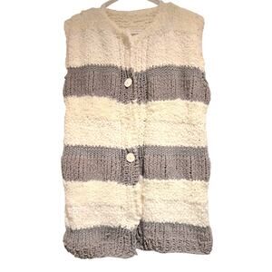Cozy, textured hand-knit vest featuring wide horizontal stripes in soft cream, taupe and gray. Yarns with different textures gives it a plush, dimensional feel. Front button closure with coordinating buttons. Can be worn open or closed. Approx. 26" long. Listed as a Size Large based on armpit to armpit measurement of 20". Excellent condition with no flaws noted.