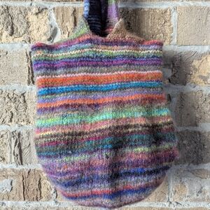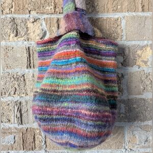Hand knit colorful wool crossbody bag. Long strap goes into short strap to close bag. Colorful circular knit pattern. Boho hippie earth mother style. Sustainable natural fibers. Clean. No flaws.