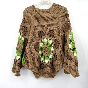 Handmade crochet poncho with a vintage 1970s boho style. Features a rustic green and brown design crafted by hand Ideal for adding a stylish, cozy layer to any outfit.