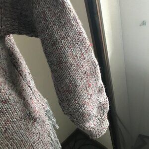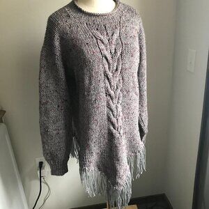 New Handknit Gray and Maroon Wool Cable Knit Long Line Fringe Sweater Size M