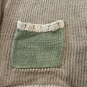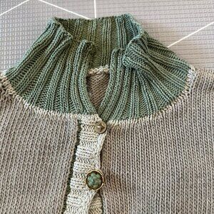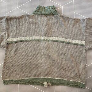 Handknit Oversized Beige Sweater with Cream & Green Accents & Antique Buttons