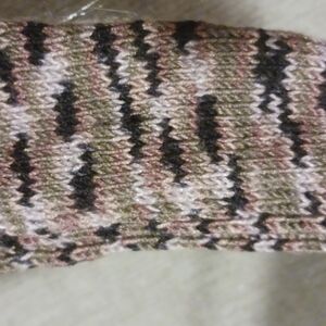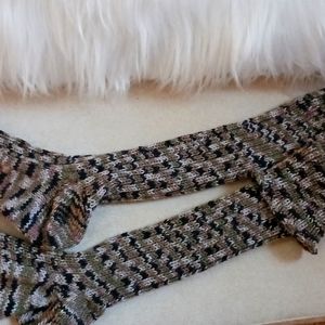 Hand-knit socks in a camo pattern, khaki and black. Great for outdoorsy girls. Fits women's size 7 - 8.5. Yarn is bamboo, silk and merino wool blend. Super comfy, squishy soft and machine washable. One of a kind