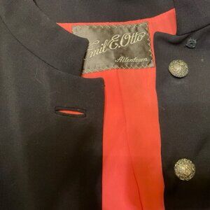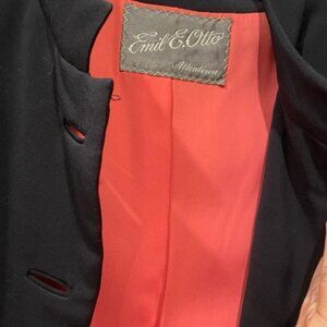Circa 40s-50s Tailored by Handmacher black woolen skirt and blazer. This suit has an additional label of Emil E.Otto, which was a high-end women's clothing store 1940s to 60s, in Allentown, PA. Blazer has exquisite silver buttons, and fabric bows at bottom of garment. Fully lined with beautiful pink lining. 19.5 inches armpit to armpit, 19.5 inches length. Inner sleeve seam is 12.5 inches. Skirt is fully lined with black lining. 27" waist, 26 3/4 inch length. The pictures do not do justice to this suit!
