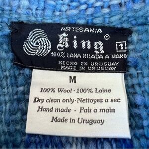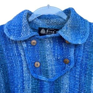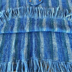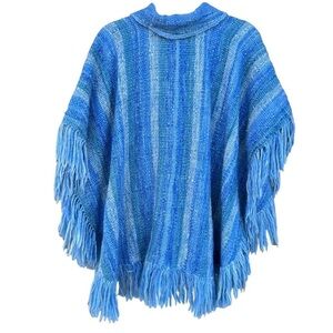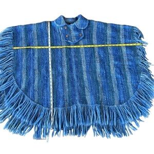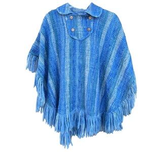 Artesania King Handmade Woven Wool Fringe Poncho. Size Medium. 100% wool, multi-tone Blue Stripe with decorative fringe edges. (4) button placket detail with wood-look buttons. Peter Pan collar. Beautiful craftsmanship! Poncho is in great preowned condition!
