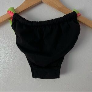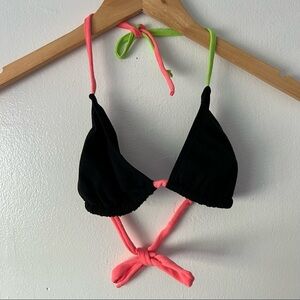 Main color is black with pink and green details. Triangle top design and tanga bottom with adjustable slide. You can adjust the pieces to cover as much or as little as you’d like. Cotton blend material.