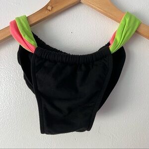 Main color is black with pink and green details. Triangle top design and tanga bottom with adjustable slide. You can adjust the pieces to cover as much or as little as you’d like. Cotton blend material.