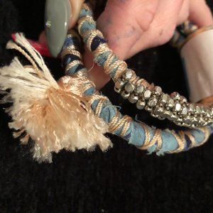 BNWT: denim and bead wrapped bangle set with fabric tassel. Thread wrapping is a very light pastel peachy pink. All jewelry is one of a kind made by me! check out more stuff in my etsy shop: etsy.com/shop/el7e • for new styles, flash sales, and fresh updates; follow me on IG @_originelle & originelle on Facebook! *use code POSH777 for 15% off on etsy!* STAY TRUE! 📿 o r i g i n e l l e 💎✨