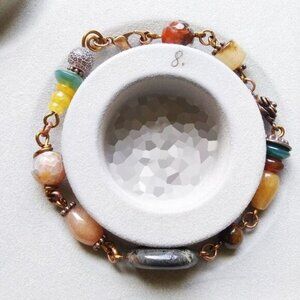 >>> Fits a 7.5-8" wrist - which is the average woman's size wrist. Various semi-precious stones include different types of Agate and Jasper Beads, Carnelian, a pretty glass bead, a copper floral rose connector. Securely closes with a lobster claw clasp.