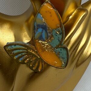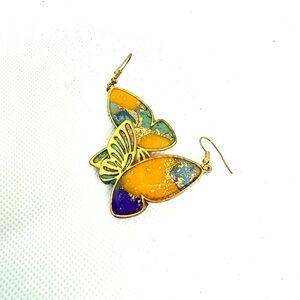 A delicate fusion of art and nature, this earring captures the beauty of transformation. The butterfly silhouette is filled with a vibrant mix of golden amber, turquoise blue, and speckled green, finished with touches of shimmering gold. Lightweight yet bold, it’s designed to bring a graceful pop of color to any look.