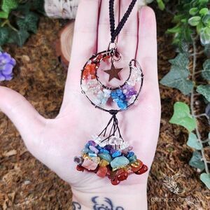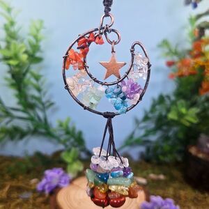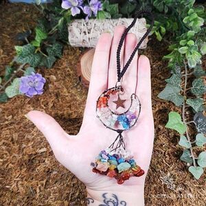 This piece measures 8.25" long and is hand-crafted with chips of red jasper, orange aventurine, citrine, turquoise howlite, amethyst and clear quartz. It has a woven loop at the top, making it perfect to hang on your wall, in your car, or even to wear on a necklace cord!
