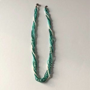 Gorgeous hand beaded multi-strand necklace made up of 7 strands. Beads are a variety of sizes with 3 shades of green and 1 strand of white beads. Each end has a sliver toned end cap with detailed silver clasp. You can twist it as shown in photos or untwist it for a looser display of strands.