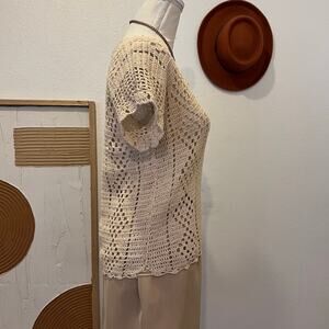 1970s Handmade Woven Cream Short Sleeve Indie Semi Sheer Crocheted Top