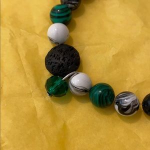 Brand new handmade bracelet. You can diffuse essential oils with the lava stone or just wear it for style! Lobster clasp is silver tone and it has a single green bead next to the largest central lava stone. The green beads look like malachite but they are not. This is a beautiful everyday piece of jewelry.