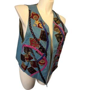 Handmade 80s Boho Reversible Vest Sz XL–2X Denim Patchwork Applique Stripe Cotto