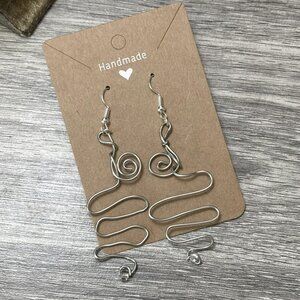 These handmade statement earrings feature an abstract, freeform design crafted from silver-tone wire. The artistic swirls and curves create a bold, modern look, making them perfect for adding a unique touch to any outfit. Lightweight and eye-catching, these earrings are ideal for those who love creative, one-of-a-kind accessories.