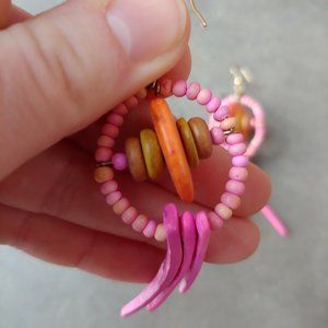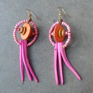Handmade Abstract Tribal Pink Orange Wooden Bead Earrings