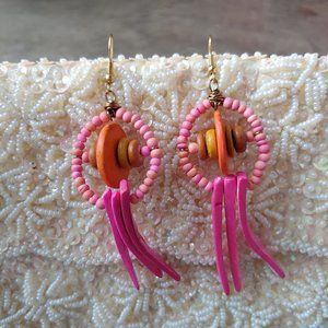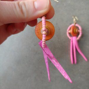 Handmade earrings made from repurposed materials including various pink, orange, and brown wooden beads, gold/bronze metal wire, and gold metal fish hook style earrings. Twine and Stones jewelry is made from repurposed materials and may have unique patina. This pair of earrings does not come with tags but is a new, handmade boutique item by me and has never been worn. 3" long. Circle part is 1" diameter. No trades. No modeling. Make a reasonable offer. Thanks!
