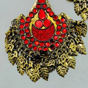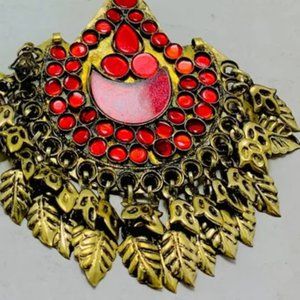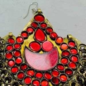 These alluring red glass stones tribal earrings are a tantalizing piece of tribal jewelry. The glass stones of cherry red color are inlaid in this piece of tribal art. These handcrafted ethnic jewelry earrings showcase the rich cultural heritage of Afghanistan, making them a unique and eye-catching addition to your collection.