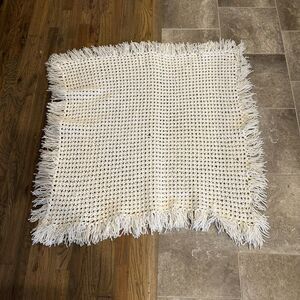 Handmade Afghan white baby Blanket Cozy handmade afghan. Features a textured pattern. White color with fringe edges.