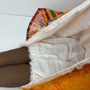 A beautifully handmade cloth doll, adorned in a vibrant Kente-patterned dress, exuding charm and cultural significance. Her braided hair, accessorized with golden beads, reflects artistry and tradition, making her a unique treasure.