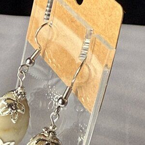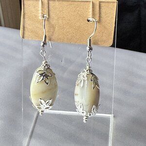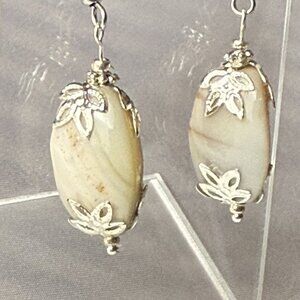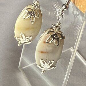 FEATURES: Main stone: Natural Agate (oval-shaped bead) / Silver-tone stainless steel floral bead caps and ear hooks / Artisan - Boho - Earthy Elegance / See photos for more details
