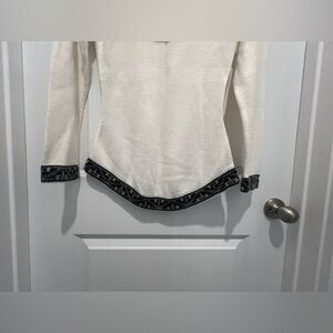 Gently worn sweater made in Peru from 100% baby alpaca wool. This multicolor cream sweater features stylish black trim. Excellent condition with no signs of wear or stains.