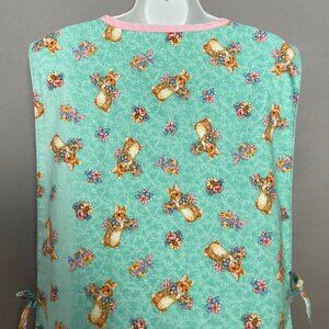 Handmade apron with front and back panels. Sweet pattern of bunnies. Appliqued circles over stripes on the chest and pocket on front. Ties at the sides. Use as a kitchen apron or as an art smock. Mottled light greenish/teal print.
