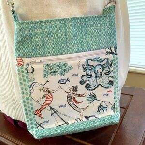 This is a handmade one-of-a-kind shoulder bag or crossbody bag. Made of 100% cotton fabric and constructed with interfacing for structure and stability. Includes adjustable strap, magnetic snap closure, lining with pockets and silver tone hardware. The front of the bag features a outside zippered pocket and the back has 2 nice slip pockets. It has a blue cotton lining with 2 interior slip pockets as well. The body of the bag is made of a coordinating textured and polka dot aqua fabric with a front and back panel featuring a cute undersea merman and mermaid. It measures about 8 inches tall, 7.5 inches wide and 1.5 inch deep. The adjustable strap can be worn as a shoulder bag or lengthened into a crossbody bag. This is a very cute bag, handmade with care and attention to detail. Versatile and durable, yet so pretty and fun. You will get compliments whenever you carry this super sweet handbag.