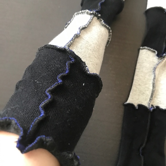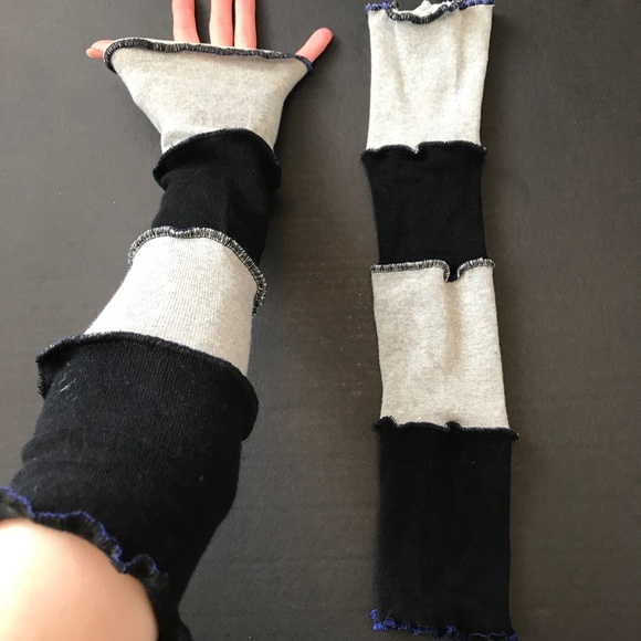 Unisex, soft and warm! Black and gray patchwork knit arm warmers with funky blue stitching. Made from recycled materials.