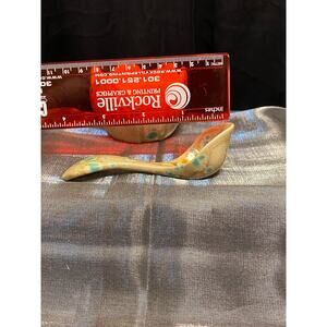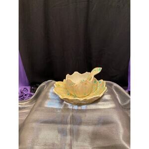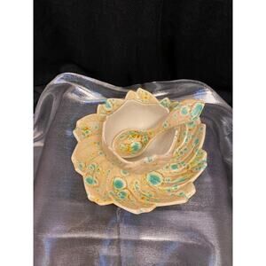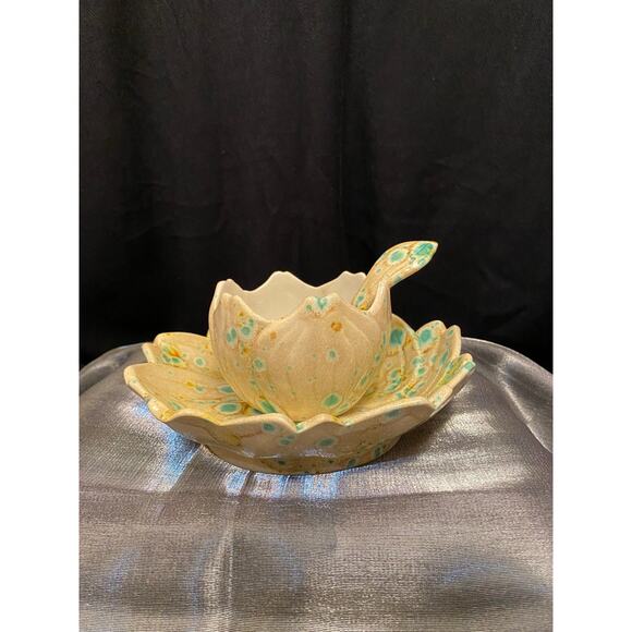 Handmade, Art Pottery Condiment Serving Set, Three (3) pieces. Bowl/Jar/Cup for jelly, honey, mustard etc. Under plate/saucer or separate serving dish. And a little serving spoon with deep bowl to it. Possibly a hobbyist/student piece, if so they surely earned an “A”. Beautiful, spotty glaze mimics a psychedelic “trip”, Lol, or maybe bacteria in a Petri dish, or even the cover of a record album called “Primal Forms” by Shackleton & Zimpel. Pretty shades of aqua green, yellows, browns on an ivory/beige base color. Pottery has a swirled texture. Very Boho!! Approximate measurements: Under plate/Bowl is 6 1/2 in at widest. 3 3/4 in across bottom. Spoon is 4 3/4 in long, 1 1/2 in at widest. Jar/Cup is 3 1/4 in round, 2 in across bottom. Unsigned. Possibly a mold mark on the bottom of the plate. Please examine all pictures as they are part of the description. Any imperfections are disclosed to the best of my knowledge.