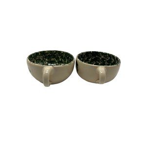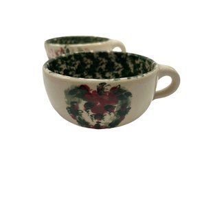 Nice set of large soup bowls with handles. They are sponge painted with green on the inside and a red and green heart on one bowl and a red and green flower on the other. They would be great cuddled up next to the fireplace with a big cup of soup or a big cup of hot chocolate.
