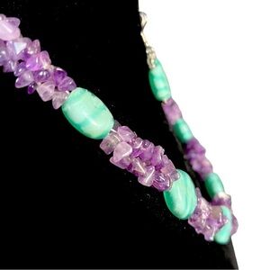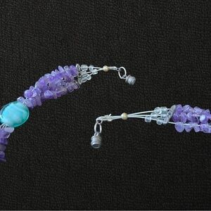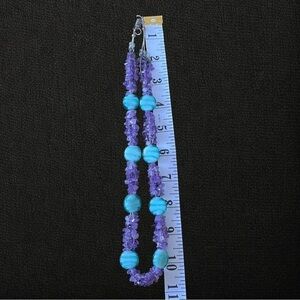 Stunning blue wavy glass beads with multi-string small polished amethyst stones throughout. Necklace measures approx. 21" around. Clasp is easy-to-use magnetic pairing. Comes with matching blue glass dangle earrings.
