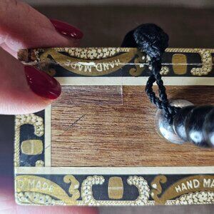 A unique handmade wood vintage Arturo Fuente imported cigar box purse with black bead handle and black tassel. It opens and closes at the top, bottom edge with a black bead and black elastic band. Inside bottom of the purse has red felt fabric lining. The graphics on this cigar box are very neat. The purse is in good vintage conditions. I see a few condition issues. There is one fine scratch that runs diagonally on the backside, but because of the grain of the wood, it's hard to actually see the issue. The only other issue I found is the previous owner put a small piece of Scotch tape to hold a piece of a papered edge in place. See my pic showing these issues. Dimensions: 9.25" x 7 5/8" x 2 1/8" Non smoking pet free home.