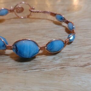 This handmade copper wire bracelet features gorgeous upcycled baby blue glass beads with unique marbled swirls and soft faceted shine. Each bead is individually wrapped in warm copper wire, creating a secure and elegant setting that highlights the beautiful variations in every glass piece. Lightweight, comfortable, and one-of-a-kind, this bracelet is perfect for daily wear or adding a pop of color to your outfit.