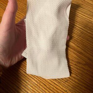 White soft and stretchy handmade headband bow. Has cute rhinestone detail on corners. Knot secured in place with a small amount of glue.