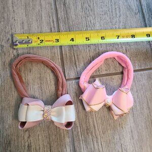 Darling handmade set of 2 boutique baby headbands. Each headband features a soft, stretchy band for comfort and a decorative bow for style. One includes a pink and white layered ribbon bow with a rhinestone accent, while the other showcases a pink bow trimmed with gold edges and a pearl center. Perfect for photo shoots, special occasions, or everyday wear.