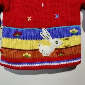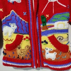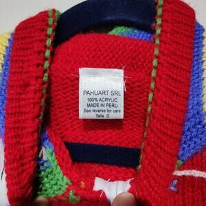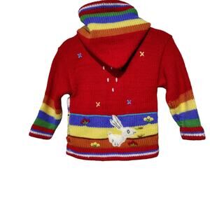 Handmade Peruvian baby full zip hooded baby sweater. Bright red with colorful embroidered mountain scene pattern. Good condition, a few small pulls, but nothing major.