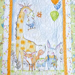Beautifully handmade baby quilt from Cori Dantini’s Hello World: Good Day (Wee Pals) collection for Blend Fabrics. The animal panel—featuring a giraffe, bunny, fox, hedgehog, bird, and balloons—has been carefully quilted with an allover swirl pattern, and the edges are bound smoothly and evenly. The workmanship is clean and professional.