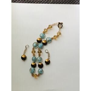 Handmade baby blue and gold dust encased in clear glass beads with clear and antiqued gold glass beads 20in necklace with a decorative gold toggle clasp. matching 2.25in earrings. *Pen not included