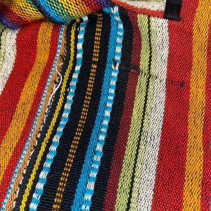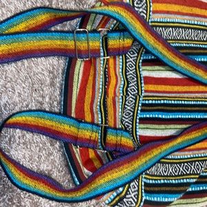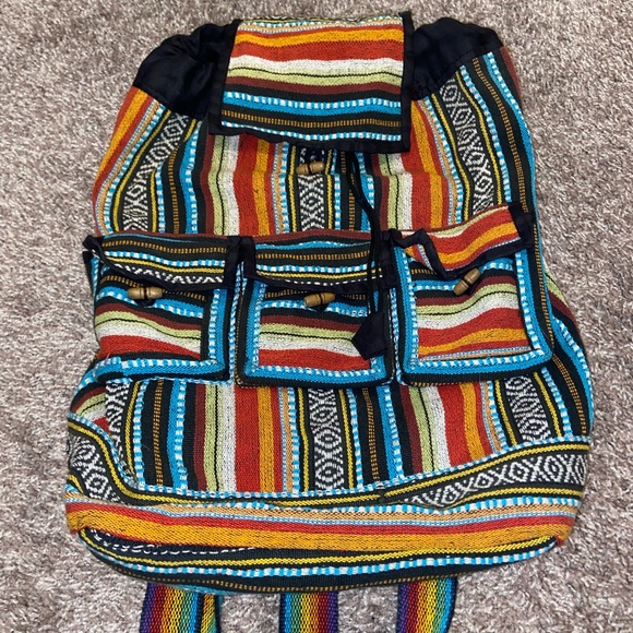 Super cool handmade book bag/backpack. I’m sad to part with this piece, I just haven’t used it like I intended, so I’d like for it to get some love. I’ve only used it once or twice so it’s in great condition minus so minor flaws that came with it. Has three front pockets and a drawstring closure. It’s super roomy, too!