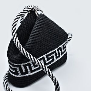 This unique, brand new and stylish backpack has been handmade from high quality cotton yarn in dark gray color. The Greek Key design is from the same yarn of light gray color. Elegant and roomy, it is perfect for everyday use or special occasion. Lined with luxurious polyester silk in silver color with zipper pocket.