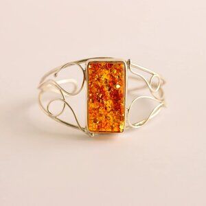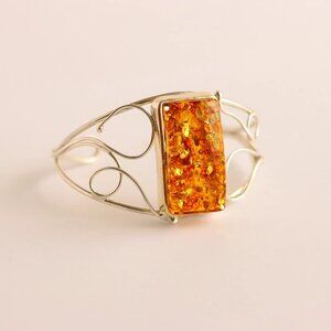 This Baltic cognac amber cuff bracelet is crafted with a glowing rectangular gemstone set in 925 sterling silver. The openwork silver frame flows gracefully around the wrist, while the amber displays rich cognac tones with natural green flecks that shimmer under the light. Each detail highlights the beauty of Baltic amber and fine silverwork, making this cuff bracelet a distinctive piece for any collection.