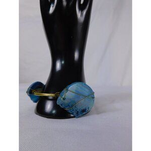 Handmade Bangle Bracelet Blue Agate Wire Wrapped Gold Tone Boho Statement Jewelry