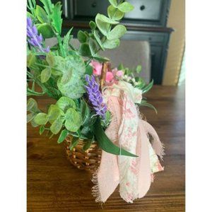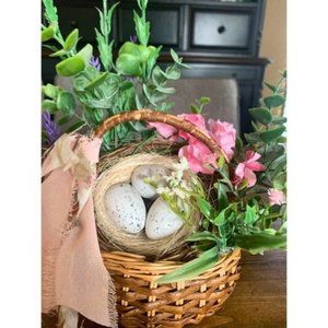 Handmade Basket With Floral Arrangement Greenery A Nest And Bird's Eggs Chiffon Ribbons Farmhouse