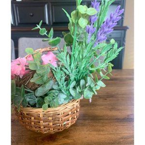 "Elevate your spring decor with this charming handmade basket, adorned with an array of flowers, greenery, a nest, and birds' eggs, accented with delicate chiffon ribbons. Perfect for adding a touch of farmhouse charm to any space, this cheerful piece is sure to brighten up your home. Whether displayed on a stack of books, a mantelpiece or as a centerpiece on your dining table, it brings a breath of fresh air and the vibrant spirit of spring indoors. Embrace the season with this delightful addition to your decor, and let its whimsical appeal transform your home into a welcoming sanctuary of warmth and beauty."