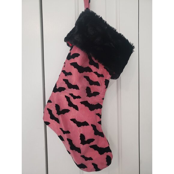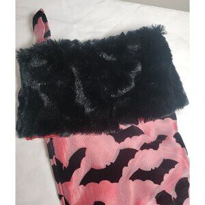 This handmade bat stocking is super cute. It is made with red satin fabric covered with a white sheer fabric that has felt bats on it. Super soft fuzzy fabrif at the top of the stocking. It is red satin inside.