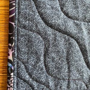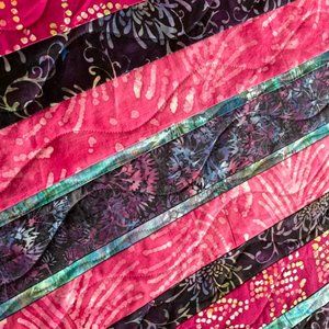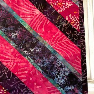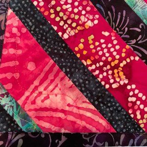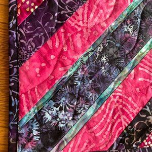 I made this pretty quilt from leftover strips from a good quality Batik jelly roll. A sleeve has been sewn on the back so it's ready for display, or use it as a table topper, or even a lap quilt for baby or toddler in a stroller. Size is 24"x24". Backing fabric is a navy botanical print. I machine quilted along all strips for interest, and to break up the diagonal lines. Binding has been mitered and machine sewn for durability. A label has been added to the back. I have numerous other quilts - contact me for details. Thanks for looking!