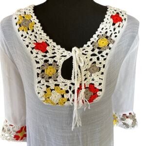 Crochet Accents: Beautiful hand-crocheted floral granny square detailing at the neckline, sleeve cuffs, and hem, featuring cheerful red, yellow, and neutral tones