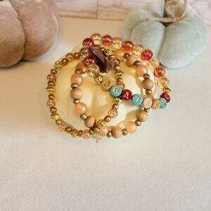 Beautiful handmade beaded bracelet set featuring a colorful GRATEFUL word bracelet and two coordinating neutral gold + blush pieces. Perfect for Thanksgiving!